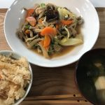 秋野菜炒めは豚肉、人参、玉ねぎ、キャベツ、もやし、茄子、ピーマン、木耳、しめじと怒涛の9品目。