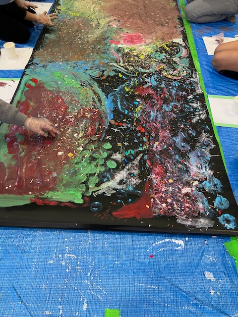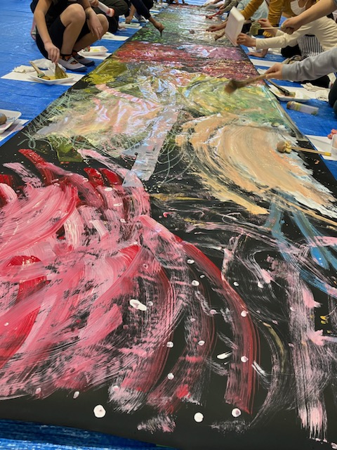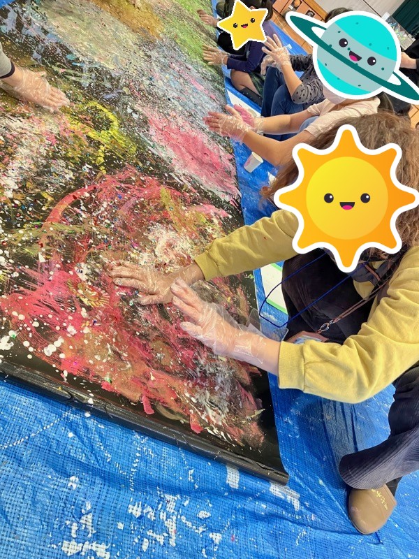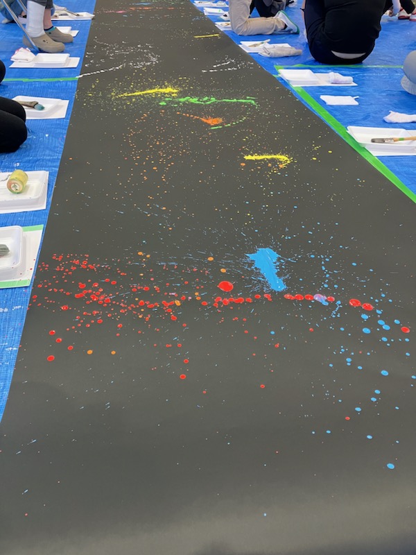 みんなで宇宙を作りましょう!という壮大なテーマの下、帯状の黒い画用紙に絵の具を撒いて、
