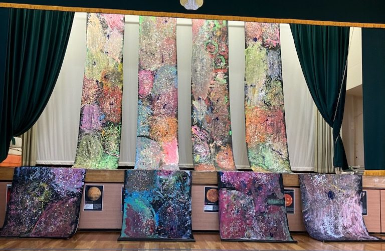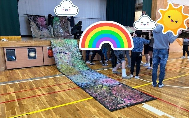 みんなで運んで、並べて吊るすと、体育館のステージに壮大な宇宙が🌟🌌