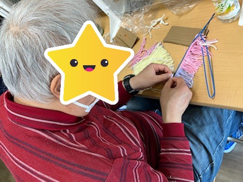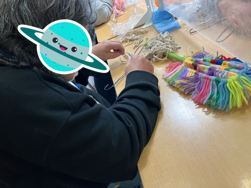 かぎ針編みが難しい方には針金ハンガーとアクリル毛糸ではたき作りに挑戦してもらっています🧹