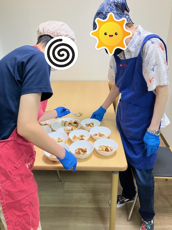 利用者 2023.08.16 8月お菓子作り🍨(リカバリーセンター転) 暑い暑い8月ですが今月もお菓子作りをしました! フルーツポンチとおまけのパンラスクです。 フルーツポンチは、盛り付けだけでなく、包丁を使う練習を、 パンラスクは焼き揚げる作業をメンバーさんにやってもらっています。 一人では難しい、やらないことに取り組む機会になっているようで、 楽しい&おいしい、一番人気のプログラムです✨ Prev一覧へ戻るNext