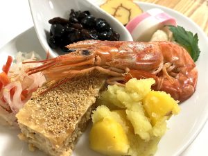 おせちは蒸し海老、のし鶏(松風焼き)、黒豆、伊達巻、大根と人参の膾、蒲鉾、菊花カブ、栗きんとん。