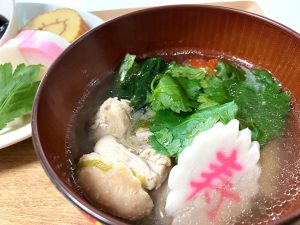 お雑煮は鶏、大根、人参、葱、ナルト、三つ葉にお餅です。