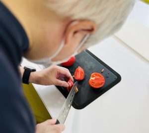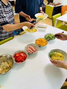 包丁を使ったり、火を使ったり、慌てずゆっくり、スタッフが見守りながら、それぞれが出来ることを分担して行います。