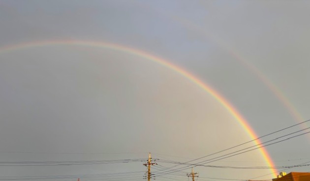利用者 2025.06.28 🌈虹をみました🌈(櫻の杜ハウス) 先週、櫻の杜ハウスから 『ダブル・レインボー』 を見ることが出来ました🌈 夕食を終えメンバーさんが帰る際、「虹が出てるよ !!!」 と教えて下さり、スタッフも外へ。 こんなにきれいなアーチ🌈 久しぶりに見ました😊😊😊 虹はスピリチュアルの世界でも「幸運の前触れ」などの意味を持ち、 虹を見るのは良いことが起こる前兆だと言われています。 「良いことがあるよ、絶対 !」と話しながらしばらく眺め、とても幸せな気持ちになりました😊😊😊 Prev一覧へ戻るNext