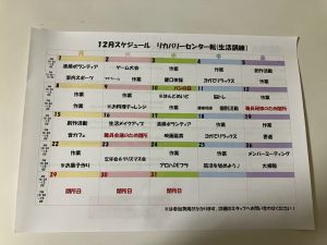 利用者 2025.12.18 リカバリーセンター転 12月のスケジュールです! こんにちは!師走に入って、朝夕は冬らしい寒さとなってきましたが、お昼間は暖かい日もあって、そんな時は過ごしやすくて嬉しくなりますね☆ 先月から引き続き、感染症が大流行中です。手洗いうがい換気を心がけて、健康第一でお過ごしくださいね。 皆さま、よいお年をお迎えください。 12月のスケジュールをお知らせいたします。 ご興味のある方はお気軽にご連絡くださいね! Prev一覧へ戻る
