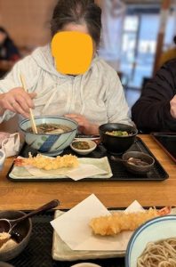 利用者 2026.02.09 1月外出プログラム~高幡不動~ 1月30日に今年初の外出プログラム、高幡不動の初詣に行ってきました。 風は冷たいけど、気持ちの良い冬晴れの日でした。 最初に参拝をした後、まずは腹ごしらえ。参道にある「開運そば」にお邪魔しました。 皆さん、メニューを見ながらじっくりと頼むものを選んでいました。できたお蕎麦が届くと、笑顔で召し上がっていました。 食後はお土産を買う人、おみくじを買う人、散策をする人とグループに分かれ、それぞれの時間を過ごしました。 今年も良い年になりますように♪ Prev一覧へ戻る
